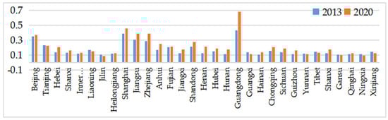 The level of high-quality financial development in 2013 and 2020.
