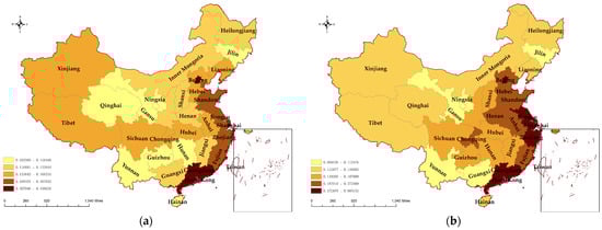 Regional Distribution map of the level of high-quality financial development: (a) 2013; (b) 2020.
