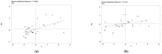 Since the global Moran’s I index cannot describe local regions’ spatial aggregation, we use local Moran scatter plots to analyze the spatial variability between specific regions (Figure 3). Most provincial-level regions with high-quality financial development are located in quadrants one and three. The provincial-level regions in the same quadrant are also geographically adjacent, including Shanghai, Zhejiang, Jiangsu, Shandong, Beijing, and Tianjin. Moreover, the eastern region is a hot spot showing high value and high-value aggregation. In contrast, the western region is a cold spot showing low value and low-value aggregation. In Figure 3, more provincial-level regions of the digital economyare in quadrants 1 and 3 than in quadrants 2 and 4. Therefore, using a spatial econometric model for analysis in this paper is reasonable [].