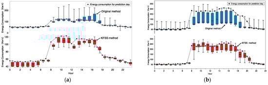 First and primary, as illustrated in Figure 5, statistical data that meet the error standards. When comparing the KFSS approach to the conventional method, the predicted number of days whose MAPE is managed within 15% rises by 14.5% in spring and by 4.9% in fall. Both the traditional and new methods can maintain the projected day’s MAPE under 15% in the summer. Second, observing statistics under the assumption of fulfilling the error is insufficient; it is important to investigate the differences in hourly prediction outcomes each day. Next, we’ll look at the mistake in predicting typical seasonal days. Figure 6 shows a 24-h boxplot of the training sample selection outcomes in three typical seasons.