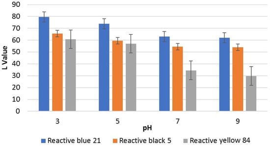 The experimental variables such as pH, ozone dose and treatment time determine the efficiency of the ozone stripping process [30]. The effect of pH on the ozone stripping method is shown in Figure 1. The results show that the lightness and lightness difference values (L, ∆L) decreased with the increase in pH for all types of reactive dyes. The L value of Reactive blue 21-dyed fabric samples after ozonation increased from 48.37 to 79.43, 73.81, 63.05 and 62.07 at the pH of 3, 5, 7 and 9, respectively. This is due to the higher ozone stability and direct attack, in molecular form, on the chromophore structures of the dyes in an acidic pH, while in a basic environment, it hydrolyzes into hydroxyl radicals, which is similar to the peroxymonosulphate oxidation process [37].). Similar behavior was observed for Reactive black 5 and Reactive yellow 84 as well. The optimum color stripping efficiency was attained while maintaining a pH of 3. However, the stripping efficiency observed in terms of the L value is the highest for Reactive blue 21 (phthalocyanine) as compared to Reactive black 5 (diazo) and Reactive yellow 84 (monoazo), mainly due to the difference in chromophore groups and the affinity of dyes to the textile fibers. Reactive dyes are composed of chromophore groups and anchor groups which determine the color removal efficiency of the oxidizing agent. The dye molecules attach to the fabric via covalent bonds which resist to the oxidizing and reducing agents. However, ozone strongly attacks the chromophore groups that have unsaturated bonds and removes the color efficiently. According to the results (Figure 1, Figure 2 and Figure 3), the group of reactive dyes that have vinyl sulphone anchor showed higher color removal as compared to the monochlorotriazine anchor group. However, the effect of the chromophore group also showed a difference in the stripping efficiency as Reactive blue 21 with phthalocyanine chromophore is more easily removed as compared to reactive black 5 with diazo chromophore. The relationship between the color stripping efficiency and dye type is also significant; p-value > 0.001 (Table 2).
