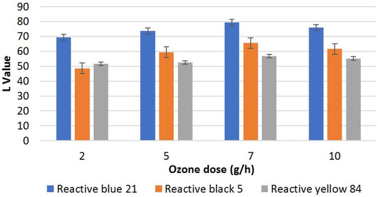 The results of various ozone doses on the L values of dyed stripped cotton fabric samples are shown in Figure 2. The L and ∆L values increase with the increase in ozone dose for all types of reactive dyes, which is due to the higher concentration of dissolved ozone, to react with the conjugated double bonds [38]. The L values of CI Reactive blue 21, CI Reactive black 5 and CI Reactive yellow 84 increased from 48.37 to 79.43, from 13.92 to 65.54, and from 49.23 to 56.7, respectively, by increasing the ozone dose from 2 g/h to 7 g/h. (Table 3). However, increasing the ozone dose higher than 7 g/h did not improve the lightness any further due to the conversion of unsaturated bonds into saturated ones that could not further react with ozone. Moreover, at a higher ozone dose, most of the gas does not react, resulting in the formation of by-products such as aldehydes and ketones, which cause further yellowing of the fabric. Therefore, 7 g/h is the optimum dose for the given setup depending on the weight of fabric, reactor size and dye concentration. The p-value < 0.001 represents that there is significant relationship between the lightness value and oxidant dose (Table 2).