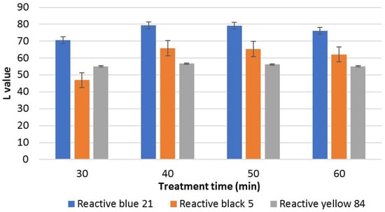 Effect of treatment time on the lightness (L) of ozone-stripped fabric samples. L values of untreated fabric are as follows: Reactive blue 21: 48.37, Reactive black 5: 13.92, Reactive yellow 84: 49.23. pH: 5, ozone dose: 10 g/h.
