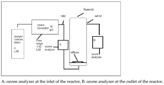 The apparatus consists of three components including the oxygen concentrator (Mark 5 of Purezone TM, USA), ozone generator (L10G of Faraday, USA) and reactor tube (60 cm height and 3.5 cm internal diameter) (Scheme 1) [34]. The ozone gas was generated from concentrated air (99% oxygen) using the corona discharge method, with the maximum capacity of 10 g/h. The ozone was introduced through a diffuser stone into the reactor to transfer it in the liquid medium for “cotton stripping”. The concentration of ozone gas (g/m3) was measured by the ozone analyzer (UVP 200 Ozonova, Germany) at the inlet of the reactor and was controlled by regulating the knob present on the ozone generator. The ozone dose (g/h) at a constant flow rate of 2 L/min was measured by the following equation given below: