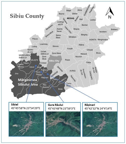 The specific folk traditions, local and international festivals, Romanian costumes, hospitality, local architecture, the picturesque landscape, and the specific cuisine recognized thanks to the traditional agricultural products and the old tradition of cheese production make Mărginimea Sibiului a special area. The locations within the Mărginimea Sibiului area of the three tourist villages chosen as case studies are shown in Figure 2.