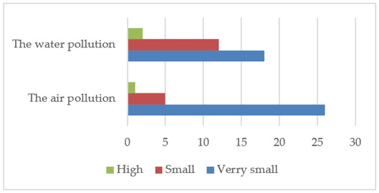 The degree of air pollution in the locality is perceived as very low by 81.25% of respondents and low by 15.63% of them. In the case of water pollution, 56.25% of respondents perceive the pollution as very low, and 37.5% perceive it as low (Figure 3).