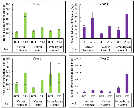 Pb uptake by tissues (root: (a–c); shoot: (d–f)) of vetiver grass and bermudagrass grown in Pb-contaminated community garden soil. BT1 = before 1st EDDS treatment, AT2 = after 2nd EDDS treatment. Data are shown as mean (n = 3) ± standard deviation.
