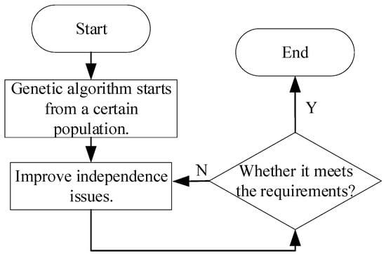 The theory of GA surrounds an intelligent algorithm derived from natural selection and genetics in biology. This algorithm first generates a population of a fixed size, and then crosses and mutates the population by setting a genetic operator similar to those of biological genetics. General individuals are eliminated via the fitness function, and the most common individual is finally selected as the solution to the problem. The solution flow of the GA is shown in Figure 2.