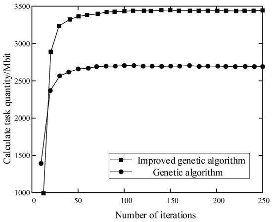 Figure 3 shows that the proposed improved GA executed more tasks within the same number of iterations, and when the number of iterations exceeded 85, the number of computation tasks tended to converge to 3440 Mbit.