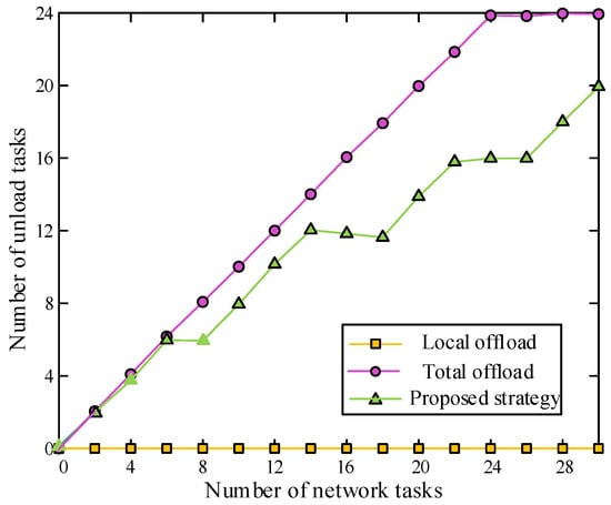 In order to observe the advantages of the proposed strategy more intuitively, three schemes were set up for comparison: Local offoad, all computing tasks are processed locally; Tocal offoad, all computing tasks are offloaded to MEC servers for processing; Proposed strategy, according to the proposed method, all tasks are first classified and sorted, and then the tasks are offloaded to different devices for processing. The relationship between the number of tasks offloaded to the MEC server and the total number of tasks is shown in Figure 4.