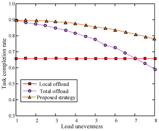 When the number of fixed on-board terminals is 45 and the total computing resources of MEC servers are 6 × 108 cycles/s, the effect of an uneven load of MEC servers on the task completion rate is as shown in Figure 5. The MEC server load unevenness factor is calculated as follows: