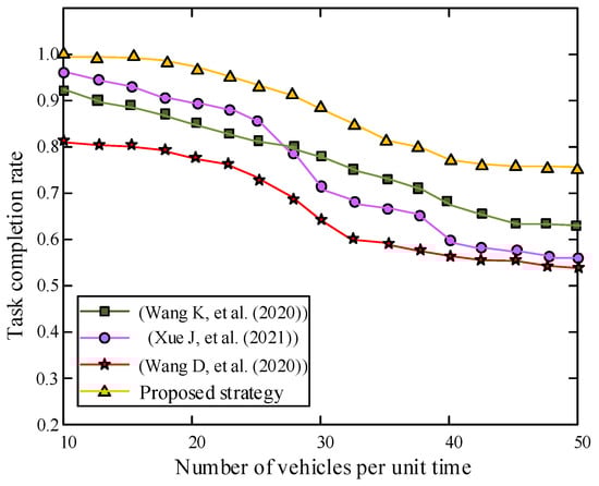 It can be observed from Figure 6 that, as the number of vehicles per unit time continues to increase, the task completion rate under all four unloading strategies decreases. When there are few computing tasks generated by vehicles, the proposed strategy and the strategies in ((Wang K, et al. (2020)); (Xue J, et al. (2021)); (Wang D, et al. (2020))) [,,] can effectively offload computing tasks. However, with the increase in the number of computing tasks per unit time, the strategy in ((Wang D, et al. (2020)); (Xue J, et al. (2021))) [,] gradually becomes less effective than the strategy in (Wang K, et al. (2020)) []. This is because the computing resources of a single MEC server are roughly the same as the computing resources of 10 in-vehicle terminals, and the increasing number of vehicles causes the local computing power to gradually exceed MEC. These two strategies cause a large number of computing task processing failures because too many computing tasks are offloaded to the MEC server.