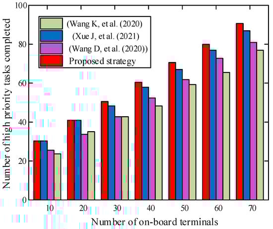 As can be observed from Figure 7, when the number of on-board terminals is 70, the completion rate of high-priority tasks is close to 90%. In addition, the average delay of the proposed strategy increases slowly. When the number of on-board terminals is 70, the average delay is about 21.2 ms. When the proposed strategy uses the improved GA to iteratively optimize the decision-making scheme, it reduces the offloading of computing tasks to the heavily-loaded MEC server. The offloading of computing tasks is added to the MEC server with a light load to achieve the effect of load balancing. Compared with other strategies, this strategy is less affected by uneven MEC server load. The strategy in (Xue J, et al. (2021)) [] performs at about the same level as the proposed strategy with fewer vehicles. Because the number of vehicles is small at this time and the generated computing tasks are insufficient, the MEC server can process all the offloaded computing tasks. The strategy in ((Wang K, et al. (2020)); (Wang D, et al. (2020))) [,] can utilize the computing resources of the vehicle terminal itself and the computing resources of the MEC server to offload tasks. Thus, some in-vehicle safety computing tasks are processed by local computing.