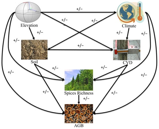Therefore, the second question is the relationship between relative humidity, soil, SR, CVD, and AGB along different regional-scale elevation gradients in different forest types. We divided the collective dataset into five local forest types; for each conceptual model, we used linear structural equation modeling (SEM) techniques (Figure 1). To investigate the 3rd question, to determine whether the relationship between relative humidity, soil, SR, CVD, AGB, and elevation fluctuates along with single-species or multi-species forest types, we again divided the data into two groups, single-species and multi-species forests, then applied linear SEM. Four fit indices, i.e., we determined the Acai information criteria (AIC), comparative fit index (CFI), the goodness of fit index (GFI), and root mean square residual (SRMR) via linear SEM model fit. The goodness of fit model is based on CFI > 0.90, GFI > 0.90, and SRMR < 0.08 [43]. We applied the same models for all seven equations. Here, we mainly focused on the relationship amongst the variables, not only the goodness of fit models. The direct effect was identified among dependent and independent variables through a direct path. The multiplication of dependent and independent measured the models’ indirect effect and mediator variables. For the current analysis, R codes previously developed by [44] were used.