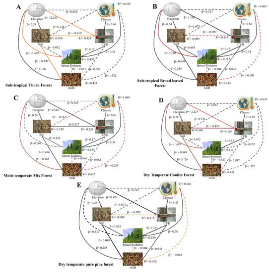 The relation among elevation, relative humidity, soil, DBH, and aboveground biomass in (A) Sub-tropical thorn forest, (B) Sub-tropical broad-leaved forest, (C) Moist temperate mixed forest, (D) Dry temperate conifer forest, and (E) Dry temperate, pure pine forest. Note: The black and orange bold lines represented positive and negative significant impacts, respectively (p < 0.05). In contrast, the dashed black and orange line shows the positive and negative insignificant impact amongst the predictors (p > 0.05). We used a standardized regression coefficient for each path. The model fits indices for tropical thorn, i.e., tropical thorn forest. CFI; 0.84; GFI; 0.90; SRMR; 0.105; AIC; 379.131. Sub-tropical broad-leaved forest. CFI; 0.981 GFI; 0.936 SRMR; 0.094 AIC; 119.305. Moist temperate mix forest, CFI; 0.913 GFI; 0.978 SRMR; 0.092 AIC; 222.596. Dry temperate conifer forest, CFI; 0.981 GFI; 0.936 SRMR; 0.094 AIC; 119.305. Dry temperate, pure, CFI; 0.840 GFI; 0.900 SRMR; 0.105 AIC; 379.131.