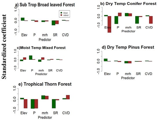 We compared direct (dark green bars) and indirect (maroon bar) effects derived from structural equation models of elevation, relative humidity, soil, and CVD on AGB along regional-scale elevation gradients of single and multi-species forest types in Pakistan. We took a standardized coefficient (Figure 6). Abbreviations: Elev, elevation; P, soil phosphorus; much, relative humidity; SR, SR, and CVD.