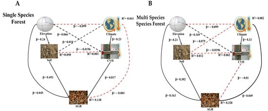 In multiple tree species forest, we saw that elevation, soil phosphorous, and relative humidity had a positive effect on AGB, i.e., (β = 0.255), (β = 0.302), (β = 0.04), while CVD had a negative effect on AGB, i.e., (β = −0.010). Relative humidity and elevation had a positive indirect effect on AGB through soil phosphorous and CVD, i.e., (β = 0.21), (β = 0.169) (Figure 5B & Table S8).