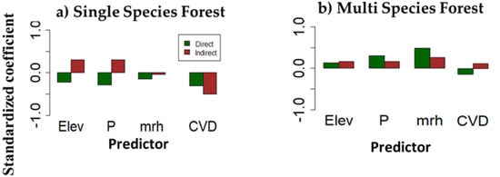4.2. Direct and Indirect Effects in Single and Multi-Species Forest Type