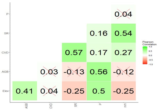 Pearson correlation among explanatory variables. Abbreviations: Elev, elevation; P, soil phosphorus; mrh, relative humidity; SR, Species Richness, and CVD, Coefficient Variation of DBH.