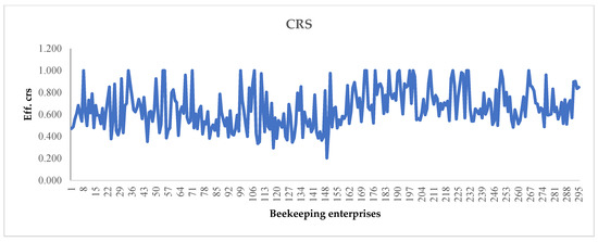In the analysis performed without bootstrap at a constant return to the scale, there is no enterprise with technical efficiency between 0–20%, and 20 enterprises operating at 100% technical efficiency were calculated. There are two enterprises with a technical efficiency of 30% or less. There are 170 enterprises with technical efficiency between 40% and 70%, and they constitute 57.6% of the total enterprises (Table 4). The distribution of technical efficiency (Eff.crs) without bootstrap at a constant return to scale is shown graphically in Figure 2. It is also seen in Eff.crs that the efficiency limits are the highest at 1.000 and the lowest at 0.200 in the analysis for all businesses.