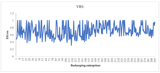 Table 1 lists descriptions of variables used in empirical analysis, including units of measurement. Four variables (for example, fixed cost (Fixcost), variable cost (Varcost), family and labor hired (Labor), and the number of hives (Hivescount) capture the inputs used in honey production total (Honeyprod). By using these variables, minimization analysis was performed with a variable return to scale (VRS) approach based on input. With Double Bootstrap DEA, it was calculated to what extent businesses could reduce their inputs to reach a stable output. So, it was analyzed how low the input level of these variables could be produced with the same amount of honey.