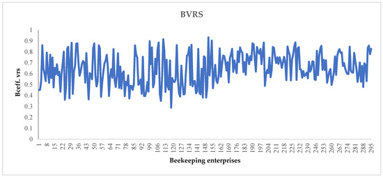 In the analysis performed with bootstrap with variable returns to scale, there is no business between 0–20% and 100% technical efficiency. There is one business with a technical efficiency of 30% or less. There are 192 enterprises with a technical efficiency of 50–80%, and they constitute 65.1% of the total enterprises (Table 4). The distribution of technical efficiency with bootstrap at variable returns to scale (Bceff.vrs) is graphically shown in Figure 5. As seen in Graph 5, there are no businesses within the 1000 limit captured by Eff.vrs in Graph 4.
