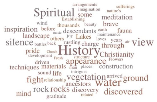 To analyse tourist satisfaction, we used the interview method, which included 718 interviews with tourists who visited the seven analysed attractions during the study period (June–September 2022). A word cloud was created on the basis of the responses of participants to the following question: “How do you feel when you arrive at this site?” A larger font size denotes a more frequent issue. This analysis revealed that tourists expressed attention, importance, and interest in what sensitised or satisfied them during their visits to these attractions (
