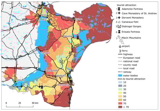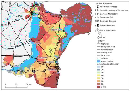 Cartographic representations provide precise information on the distances and travel time required to reach desired tourist destinations. The primary aim is to identify regions within Dobrogea and its neighbouring urban localities that offer easy accessibility with an average travel time of less than 60 min. In this context, all seven identified tourist attractions in the region predominantly fall into this category, thus satisfying the set criteria. These considered tourist attractions belong to three different categories: physical–geographical (Canaraua Fetii, Macinului Mountains, and Dobrogei Gorges), cultural–religious (Monastery of St. Andrew and Dervent Monastery), and cultural–historical (Enisala Fortress and Adamclisi Fortress).