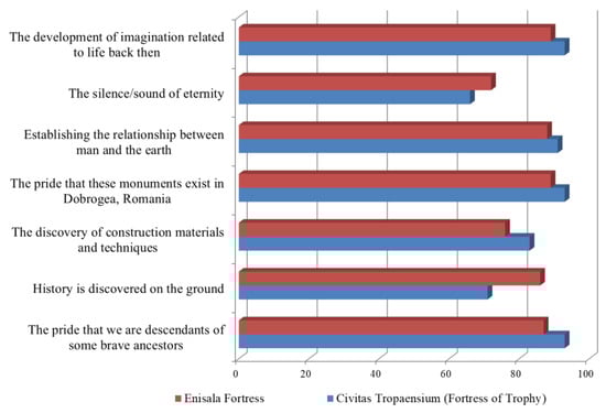 The presence of Enisala Fortress in a geographically favourable area for tourism (only 10 km from the town of Babadag) allows tourists to reach it within 12–15 min. The neighbouring villages of Sarichioi, Visterna, and Zebil are also located within a similar distance, which can be reached in up to 40 min. Those living in the westernmost areas (Harsova and its surroundings) or the deltaic region may need to travel for more than 60–70 min, which can be challenging, especially when travelling by water. The level of satisfaction among tourists visiting the Enisala Fortress is similar to that recorded for Adamclisi Fortress, reflecting a sense of pride for a historical period in which Dobrogea was under the rule of the Romanian voivode Mircea cel Batran. This type of satisfaction is enhanced, according to the interviews, by the calmness (tranquillity) offered by the vast areas of vegetation and water bodies; most tourists consider Enisala to be a perfect mix of knowledge and relaxation. This atmosphere is also enhanced by the advantage of visiting the Peasant Household Museum in Enisala, which serves as an introduction to the atmosphere that the fortress provides (in case of prior visits) or complements the unseen details of the fortress over time (when visited after the fortress). Satisfaction is expressed through enchantment, pride, relaxation, and gaining knowledge about the details of Dobrogea and Romania’s history (