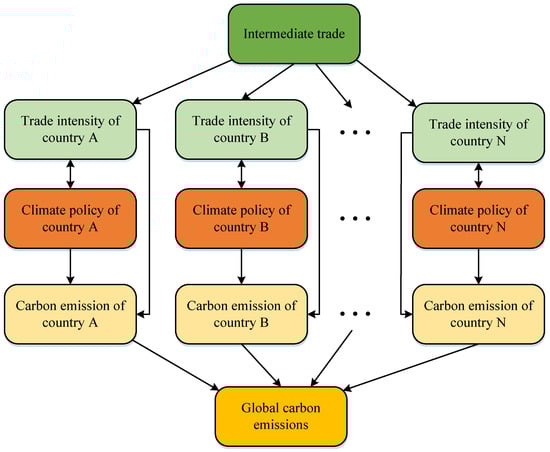 The study analyzes how climate policy and trade affect CE by constructing a multinational equilibrium model. Environmental policies and regulations can affect the transfer of carbon emissions by regulating economic activities and energy consumption. When environmental policies and regulations are formulated more strictly, such as requiring enterprises to meet a certain standard of carbon emission intensity, or requiring the use of less energy such as oil and coal, this will affect the carbon emission transfer behavior of enterprises. If companies shift towards more environmentally friendly production technologies and products, they can reduce carbon emissions and thus reduce their impact on the environment. When the government implements stricter environmental policies and regulations, it will reduce the energy consumption of enterprises, thereby reducing carbon emissions and reducing the impact on the environment. The environmental policies and regulations are such as setting stricter energy consumption standards or requiring the use of fewer energy sources such as oil and coal. Under the framework of intra-product trade, by studying the vertical links of countries in the intra-product division of labor, the input–output relationship of countries through trade is described in Figure 2.