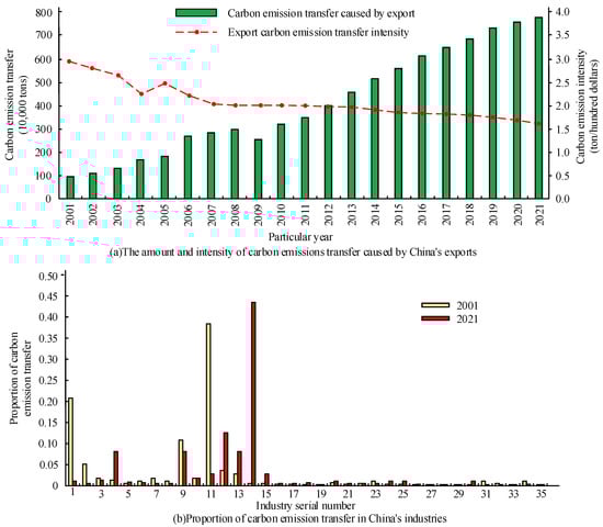 Based on the information obtained from WIOD database, the CE transfer volume and CE intensity caused by China’s exports from 2001 to 2020 are calculated by using Formulas (2) and (3). In addition, the study also calculates the proportion of export CE of each industry to analyze the differences of export CE among industries. The volume and intensity of CE transfer caused by China’s exports and the proportion of CE transfer in various industries are shown in Figure 3.