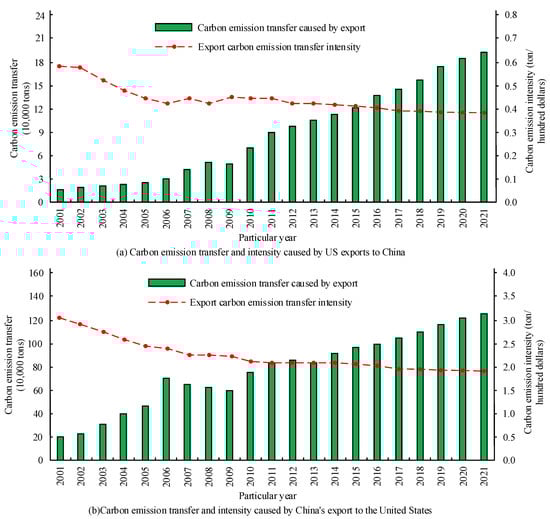 Figure 3a shows the change of CE transfer volume and CE intensity caused by China’s exports from 2001 to 2021. From Figure 3a, the total CE transfer volume caused by China’s exports increased from about 1 million tons in 2001 to 3 million tons in 2011, and reached 7.2 million tons in 2021. In addition, the export of CE intensity in China showed an overall downward trend from 2001 to 2021, and it dropped from 3.0 tons/100 dollars in 2001 to 1.6 tons/100 dollars in 2021. This shows that with the development of modern times, China’s resource costs and environmental costs in international trade have been reduced. This is of great significance to promote the sustainable development of China’s foreign trade and the green and low-carbon development of China’s economy. Figure 3b shows the proportion of export CE transfer of Chinese industries in 2001 and 2021. The three industries with the highest proportion of CE transfer in 2001 are non-metallic mineral products (0.38), agriculture, forestry, animal husbandry and fishery (0.21) and chemical products (0.11). The three industries with the highest proportion of export CE transfer in 2021 are electrical and optical equipment (0.44), base metals and metal products (0.13) and textiles (0.08). From the above comparison, China’s export of CE is mainly concentrated in a few industries. Moreover, with the growth of time, the proportion of agriculture, forestry, fishery and other industries has decreased significantly. However, the number of CE in power, optical devices and other industries has increased significantly. The change in the CE volume of industrial products, to a certain extent, shows that China’s export industry structure has changed. The proportion of traditional resource-based industries is decreasing, while the proportion of industries with high capital and technology content is increasing. To achieve the goal of energy conservation and emission reduction in the future, China must comprehensively consider the differences between industries and formulate differentiated emission reduction strategies and measures. WIOD data include 40 economies, that is, China has 39 trading partners. In order to simplify the CE transfer of China’s foreign trade, the study only uses the trade data of China and the United States to describe it. Figure 4 shows the CE transfer and CE intensity caused by US exports to China and China’s exports to the US from 2001 to 2021.