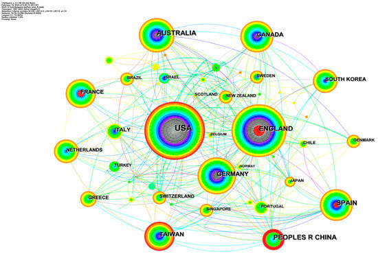 To explore inter-country collaboration, CiteSpace was used to analyze countries with published papers, with a time slice of three, as shown in Figure 2. Nodes (n = 78) correspond to institutions, and node size is related to the author’s volume of publications and the author’s relevance to other authors. Connections between nodes (e = 298) represents the state of the relationship. As we can see from the graph, the three countries with the highest number of publications are USA (347), UK (118), and China (106). The four countries with the highest bursts are the UK (10.94), China (9.56), Spain (5.2), and France (3.57), it shows that they have provided a clear direction for immersive virtual reality research in the field of education.
