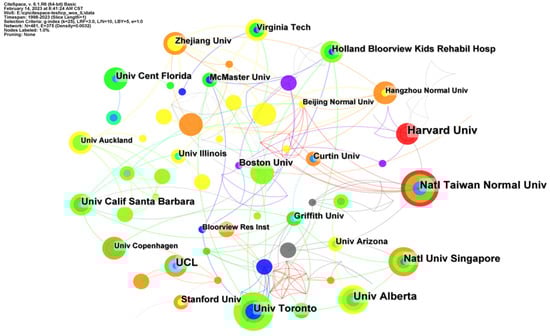 The CiteSpace software was used to map and analyze the volume of articles published by each institution, as shown in Figure 3. The results show that N (the number of nodes) = 481, E (the number of connections) = 375, and Density = 0.0032. National Taiwan Normal University is the largest node with 11 publications, but has fewer network connections to other institutions, with University of Illinois, Beijing Normal University, and National Changhua University of Education to form a collaborative subgroup.