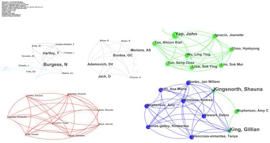 Additionally, to accurately study author collaborations, we used CiteSpace software to analyze author collaboration networks. The analysis was conducted from 1996 to 2022, with a time slice of 1 year, and ran CiteSpace software to obtain a knowledge map of the application of immersive virtual reality in education, with the number of nodes N = 684, the number of connections E = 703, and density D = 0.003 (Figure 5). The network graph is relatively fragmented, with fewer connections between class clusters. This suggests that the core team for research on IVR technology in education has not yet been established and that the major teams need to strengthen their collaboration and work together.
