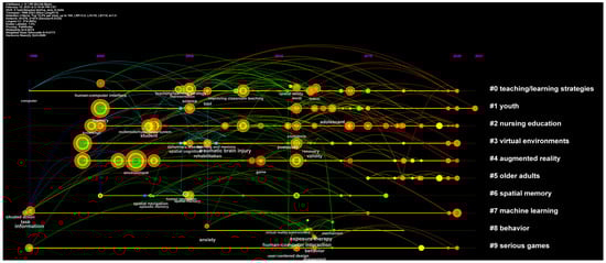 The timeline view, in which the keywords are spread out in the clusters to which they belong according to the year in which they themselves appear, is essentially a cluster diagram. According to the timeline diagram generated by the CiteSpace software for the cluster analysis of immersive virtual reality in education, the common literature on the clustering of virtual reality environment, human-computer interaction, user-centered design, and engagement citations are relatively dense (Figure 8). Virtual reality, science, and interactive learning environment were initially cited a lot, suggesting that they laid the foundation for immersive virtual reality in education. Recent research has focused on immersive virtual reality, immersive learning, deep learning, and machine learning, and the number continues to rise. Therefore, learning in an immersive virtual reality environment will be an important research topic in the future. At the same time, virtual reality technology applied to machine learning, deep learning, medicine, and other fields are also a future development trend.