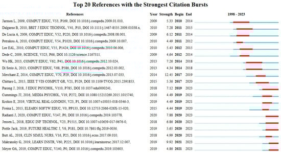 Burst words are used to monitor words with a high rate of frequency change over a certain period of time. It identifies research frontiers and trends. We analyzed the emergent words for IVR applications in the education field by CiteSpace and the results are shown in Figure 9. The article written by Merchant Z. (2014) [4] was found to be the most emergent, ranking first with a burst intensity of 12.42. It suggests that this article has guided the direction of research in the field. The article has driven the development of immersive virtual reality in education. Makransky G.’s (2019) [57] article ranked second in terms of burst intensity. Radianti J.’s (2020) [58] article ranked third in terms of burst intensity. The burst intensity also increased from 2009 to 2019 per Jarmon L. (2009) [40], Dalgarno B. (2010), Di Serio A. (2013), Cummings J.J. (2016), Parong J. (2018) and Pottle Jack (2019) [59,60,61,62,63]. Their research has been progressively refined and progressed from virtual reality technology to its application in teaching and learning to immersive learning, completing the exploration with the support of numerous experiments. The emergence of emergent terms in 2023, which has just begun, suggests that immersive virtual reality in education is a hot topic for future research.