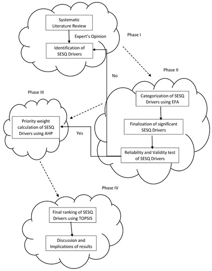 This study was conducted in four phases to evaluate the SESQ drivers and rank the travel websites from October 2022 to December 2022. The SESQ drivers were identified by a thorough assessment of the literature and expert opinions, and they were then confirmed using exploratory factor analysis (EFA). The preference weights of the validated SESQ drivers were computed using the analytical hierarchical process (AHP) technique, and then, based on the main drivers, the top 5 Indian tourism websites were ranked using the technique for order performance by similarity to the ideal solution (TOPSIS) method. To check the robustness of the results, a sensitivity analysis was conducted by changing the preference weights of the criteria. The current study’s entire research design is depicted in Figure 1, which also functions as a flow chart.