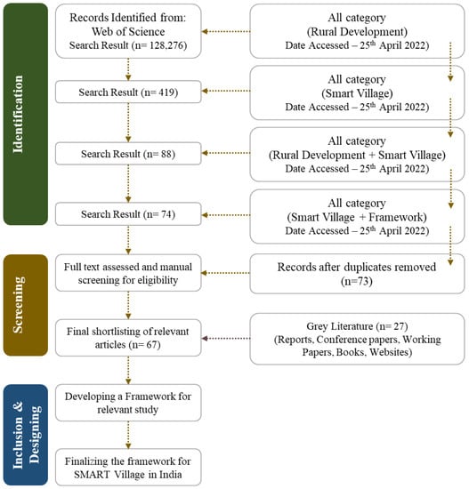 Although overview papers in the domain of smart SRD are few, there are papers from allied disciplines that review the literature in their fields. In this study, referring to RQs, a systematic review was conducted using the preferred reporting items for systematic reviews and meta-analyses (PRISMA) method guidelines proposed by Liberati et al. (2009) [28]. Following the PRISMA guidelines, the study primarily executed search queries in the Web of Science (WOS) database, and additional high-quality online sources such as books and conference proceedings. The results of the WOS basic search are depicted in Figure 1. In this case, two independent searches were conducted in the “ALL” category using the keywords “Rural Development” and “Smart Villages”. Using our set search keywords, we initially retrieved 128,276 (Rural Development: RD) and 419 (Smart Villages: SV) papers from WOS. In the context of RD, the study then modified the documents focusing on SV to filter out the search question to ‘RD + SV’, through which we identified 88 research documents. Secondly, to identify research studies focusing on framework formulation in the context of SV, the study applied another search query with the keywords ‘SV + Framework’, which identified 74 research documents. After the manual screening, the study extracted the literature database titles, and the relevant literature was determined, regardless of the field of study, year of publication, type of document, etc. Furthermore, in the next step of shortlisting research documents, the study selected 67 documents for assessment. In addition to the WOS database search, the study considered 27 other research materials and grey literature-like reports, conference papers, working papers, books, and websites for this study.