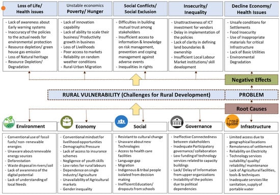 Referring to RQ2, this section focuses on the socioeconomic and environmental challenges that rural communities worldwide face. In the current context, rural populations are more vulnerable to extreme poverty, starvation, social marginalization, environmental harm, etc. [62]. The emergence of these challenges and barriers harms the person’s living conditions and creates obstacles to their advancement. Accordingly, by adopting problem tree analysis [63], a structural analysis tool, the subsequent study will address some of the inevitable problems for RD and their negative consequence in Stage 1. However, Stage 2, Section 3.2 will further describe how SMART interventions can act as catalysts to overcome the challenges for the same and how further SMART-V will lead to sustainability by achieving SDGs.