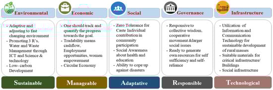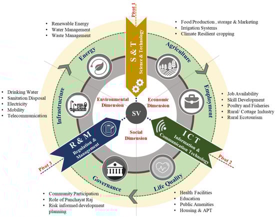 However, applying scientific and technological instruments to transforming rural regions in India poses several challenges towards its implementation and sustenance. Several studies have expressed concern for the urbanization of rural regions as a spin-off effect of the intrinsic benefits of improved infrastructures [22,23], drawing rural populations to metropolitan areas for better jobs, and infrastructure [24], thereby straining urban resources [25] and employment opportunities [26]. The current approach to SV solely emphasizes the application of technological solutions for rural infrastructure development and fails to address all aspects of rural life comprehensively. A more holistic approach that encompasses all dimensions of rural development, such as agriculture, environment, economy, social welfare, infrastructure, and governance, is necessary; thus, intending to prevent rural-urban migration and bring rural communities toward self-sufficiency, eventually. This study postulates a SMART village (SMART-V) framework that encompasses various dimensions such as sustainable environment, manageable economy, adaptive society, responsive governance, and technological infrastructure. The SMART-V thus provides a multi-dimensional evaluation framework for establishing the local relevance of sustainable development strategies and one that can provide a basis for enhancing the performance and capacities of the local governing units at rural scale.