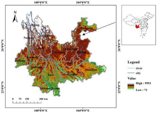 Yunnan Province is located on the Yunnan-Guizhou Plateau in southwestern China (21°8′ N~29°15′ N, 97°31′ E~106°11′ E). It is bordered by India and Myanmar in the west, and Laos and Vietnam in the south, and is at the intersection of the geographic centers of East Asia, Southeast Asia, and South Asia. The total area is km2, of which the mountain area accounts for 88.64%. The terrain is high in the northwest and low in the southeast and gradually descends from north to south (Figure 1). The climate of Yunnan belongs to the subtropical plateau monsoon type, and the vertical change in temperature with the terrain is abnormally obvious. Yunnan is extremely rich in biodiversity, mineral resources, energy resources, and is known as China’s “Kingdom of Animals and Plants” and “Kingdom of Nonferrous Metals”. It is also an ecological barrier in the upper reaches of the Yangtze River, Mekong River, Irrawaddy River, and other Southeast Asian rivers, and its ecological status is extremely important. In 2021, the GDP of Yunnan Province was 2714.676 billion yuan, an increase of 7.3% over 2020. The tertiary industrial structure was 14.3:35.3:50.4. The resident population was 46.9 million people, and the urbanization rate was 51.05%. Yunnan is the province with the largest number of ethnic minorities in China. Stable social and economic development will help promote the unity of all ethnic groups and maintain national stability.