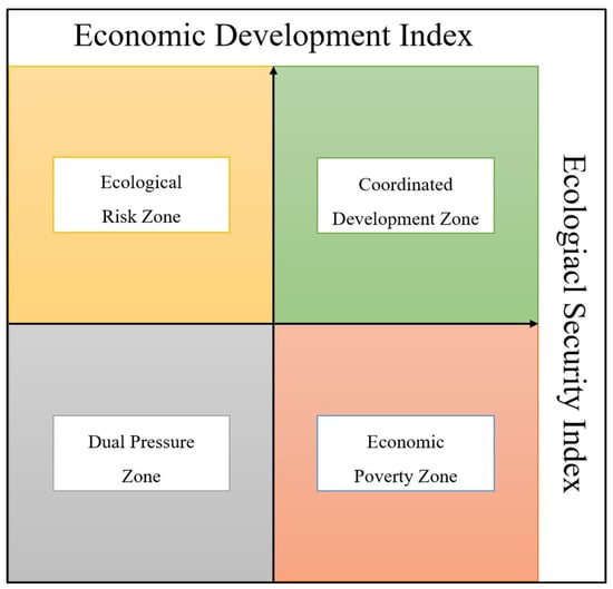 The comprehensive zoning method divides the region into four combined types of ecological security and economic development based on the median values of the ESI and EDI (Figure 2). This method can intuitively reflect the relative state of ecological security and economic development. Specifically, areas with higher than both the ESI and EDI medians are called coordinated development zones (CDZs); areas with below the ESI median value but above the EDI median value are called ecological risk zones (ERZs); areas with higher than the ESI median value but lower than the EDI median value are called economic poverty zones (EPZs); and areas with below both the ESI and EDI medians are called dual pressure zones (DPZs) [16].