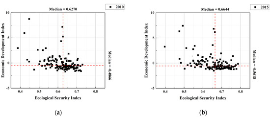 Scatter plot of comprehensive partitioning in 2010 (a), and 2015 (b). (The red lines are the median of EDI and ESI).