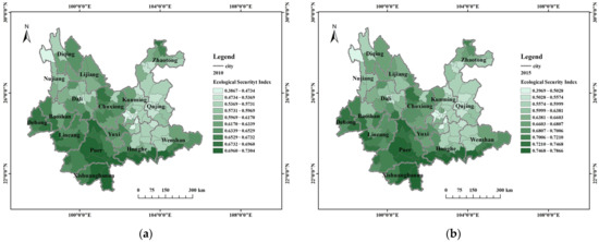 The ecological safety index () indicates the degree of regional ecological safety. The ecological security evaluation model is conducted according to the research of Zhang et al. [27]. The formula is as follows: