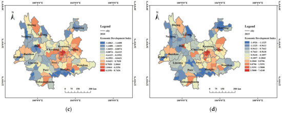 Considering the representativeness and availability of data and the universality of the evaluation system, this paper selects 10 indicators to construct the evaluation index system of economic development, as described in Table 2. The statistical data were obtained from the Yunnan Statistical Yearbook (2010 and 2015). To reduce the dimensions and summarize the complex information, the principal component analysis (PCA) method was used to calculate the economic development index (EDI).