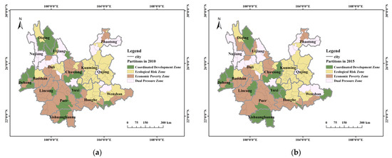 Coupling coordination degree pattern of partitions in 2010 (a), and 2015 (b).