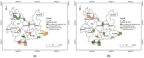 From 2010 to 2015, partitions in a total of 14 counties changed in four forms (Figure 6). Among them, Yunxian, Menghai, Mengla, Wuding, Shiping, and Funing changed from the EPZ to the CDZ, and economic development improved; Luxi changed from the DPZ to the ERZ. Although poverty has eased, environmental problems persist. Weixi, Yulong, Ning’er, Maguan, and Huaping changed from CDZ to EPZ. Most of these are areas with outstanding ecological resources but backwards economic development. Prioritizing the protection of the ecological environment will inevitably restrict regional economic development to a certain extent. Shuifu and Guangnan were changed from ERZ to DPZ. Serious damage to the ecological environment has brought obstacles to economic development.