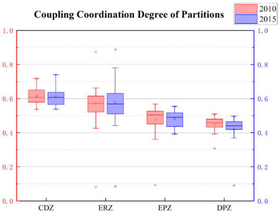 Coupling coordination degree of partitions in Yunnan Province in 2010 and 2015. (The “x” are the outliers for box diagrams).