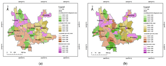 This paper calculated the ESI and EDI for the 129 communities in 2010 and 2015. The values were divided into 10 levels based on the natural fracture point classification method. According to the ESI and EDI, the comprehensive zoning results are shown in Figure 3. There was a negative correlation between the ESI and EDI. This result shows that the ecological security and economic development of Yunnan Province are still under mutual restriction.